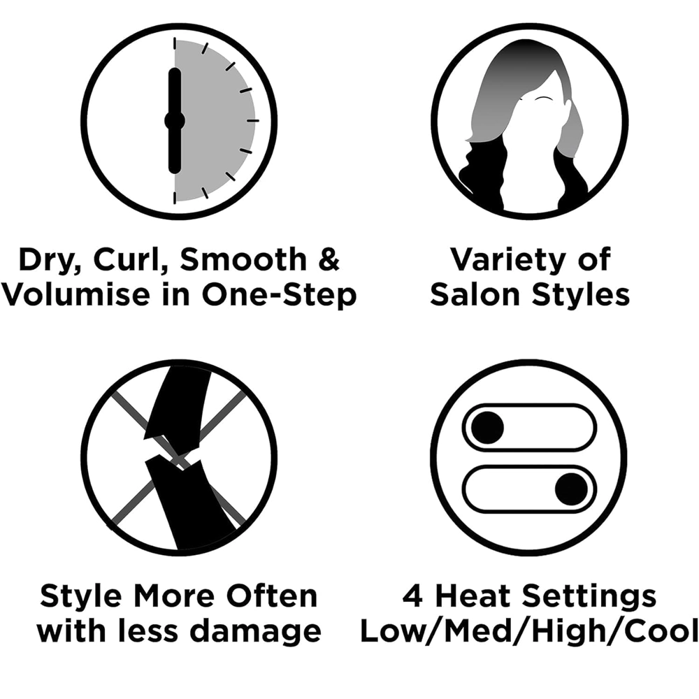 مكثف جذور Root-Drying Concentrator: يجفف الشعر عند الجذور بسرعة ويحضر شعرك لتثبيت أطول مدة للتصفيف مكواة تمويج 360° Vented Airflow Curler: تموجات ناعمة مع الحد من التلف، باستخدام برميل سيراميك تورمالين ثلاثي الطبقات فرشاة تصفيف وإعطاء حجم 64 مم Styling & Volumising Oval Brush: رفع جذور الشعر وتنعيمه مع نتائج طويلة الأمد