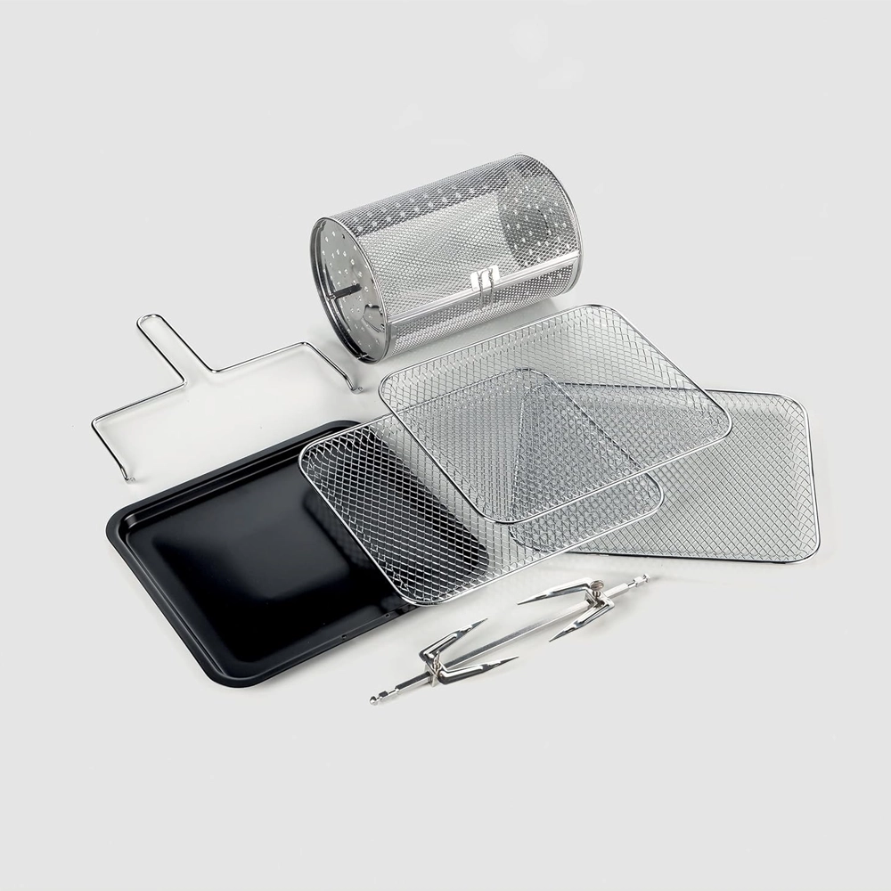 مرفقات شاملة: 3 شوايات، صينية تحميص، سيخ دوّار، سلة دوّارة، ومقبض لإزالة السيخ بسهولة وأمان.